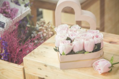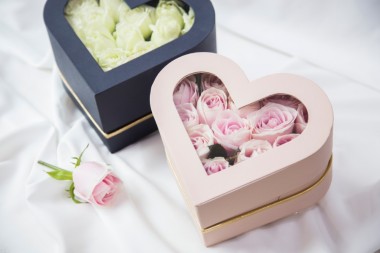 ดอกกุหลาบในกล่องดอกไม้รูปหัวใจสุดหรู สีชมพูขนาดเล็ก โดยลูกค้าสามารถปรับเปลี่ยนสีดอกไม้ได้ตามต้องการ